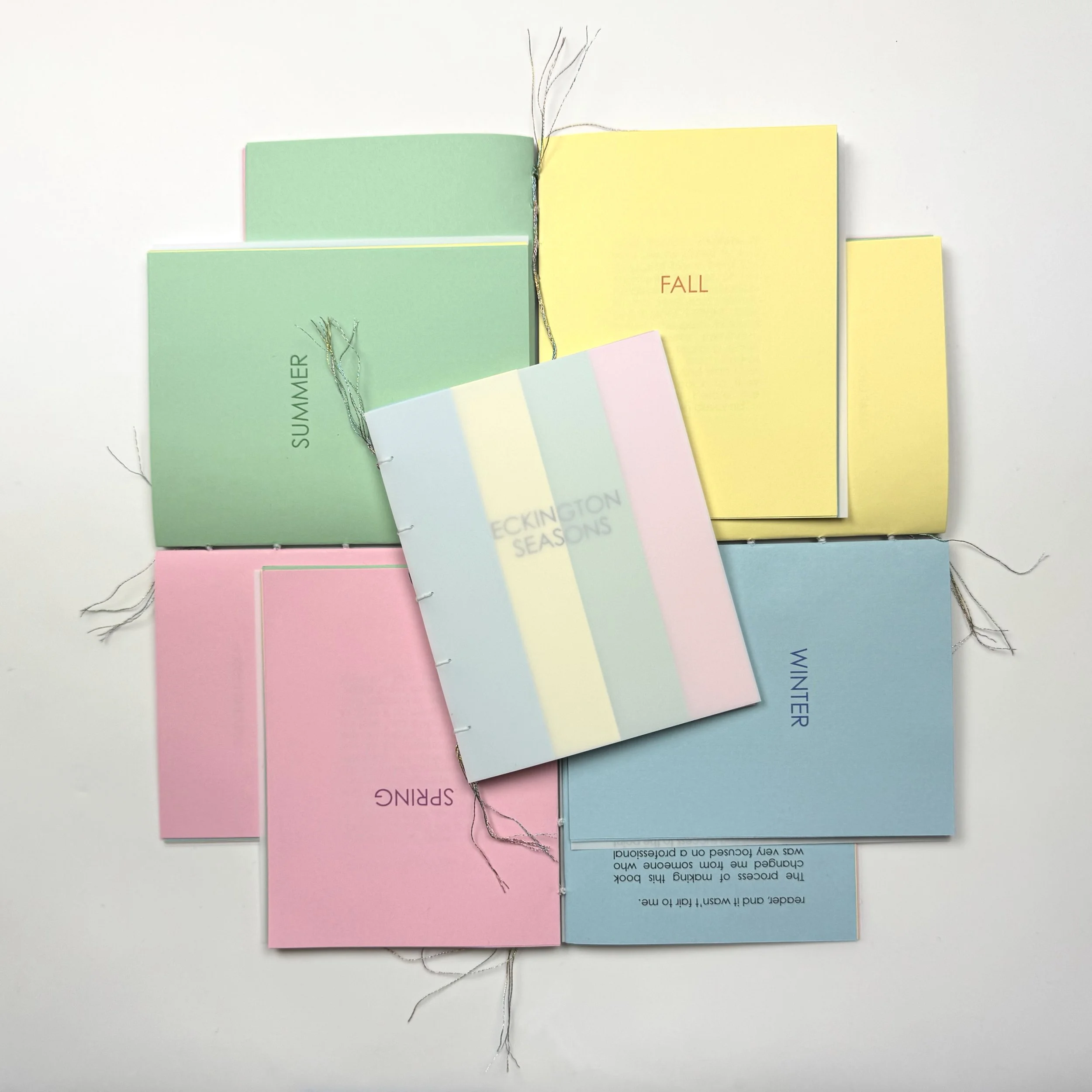 A copy of Eckington Seasons resting on top of four other copies of the book, each one open to a different season’s title page.